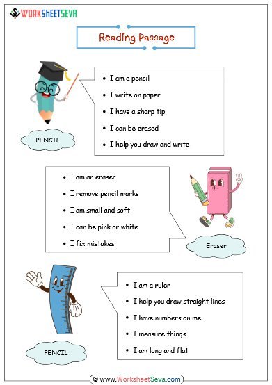 Each short passage is written in easy words, helping kids read, understand, and connect sentences about everyday classroom objects they use and love.